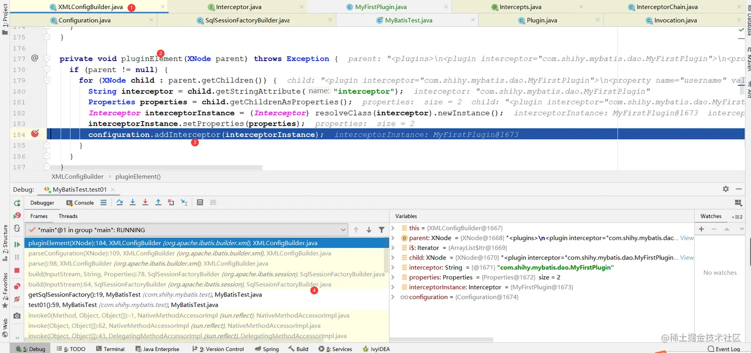 SqlSessionFactoryBuilder #build(InputStream inputStream)---->SqlSessionFactoryBuilder #SqlSessionFactory build(InputStream inputStream, String environment, Properties properties)---->XMLConfigBuilder #parse()---->XMLConfigBuilder#parseConfiguration(XNode root)---->XMLConfigBuilder#pluginElement(XNode parent)---->Configuration
