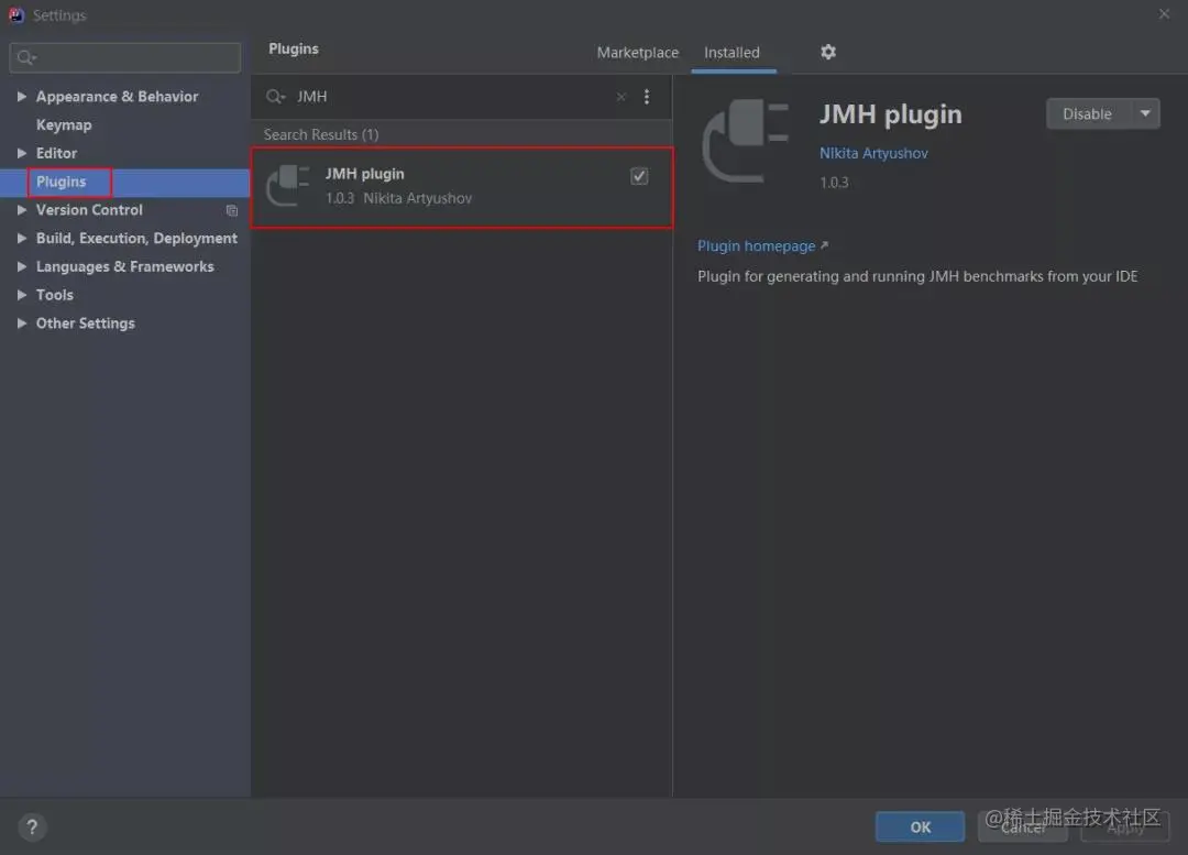 大家还可以通过 IDEA 安装 JMH 插件使 JMH 更容易实现基准测试,在 IDEA 中点击 File->Settings...->Plugins,然后搜索 jmh,选择安装 JMH plugin: