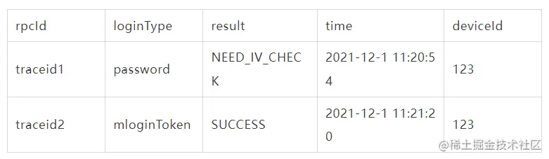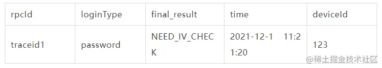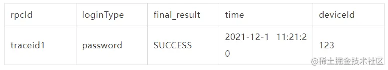 最终产出的一次登录行为登录数据”->"最终可以产出如下的一次登录行为样例数据(数据非真实用户数据)