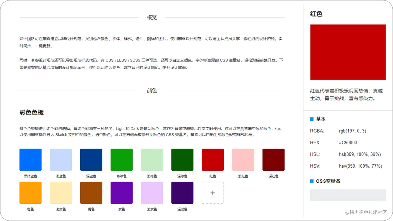 只要将设计项目与规范关联好后,对应的颜色变量、字体变量、组件代码会对应出现在属性面板上,轻轻点击就能复制成功,前款工程师就可快速引用到自己的代码中;