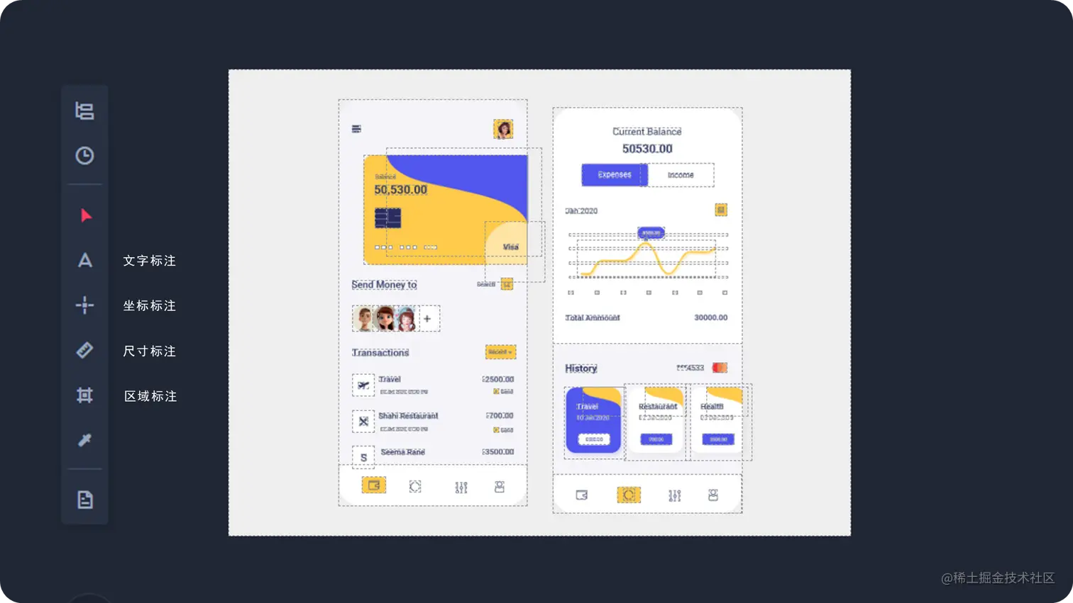 而且,智能标注无法展示的信息,摹客手动标注来弥补!除了智能标注外,设计师还可以在摹客中对设计稿进行“手动标注”,坐标、尺寸、颜色、文字,凡是你想重点传达的信息,都可以利用这几款小工具来描述;