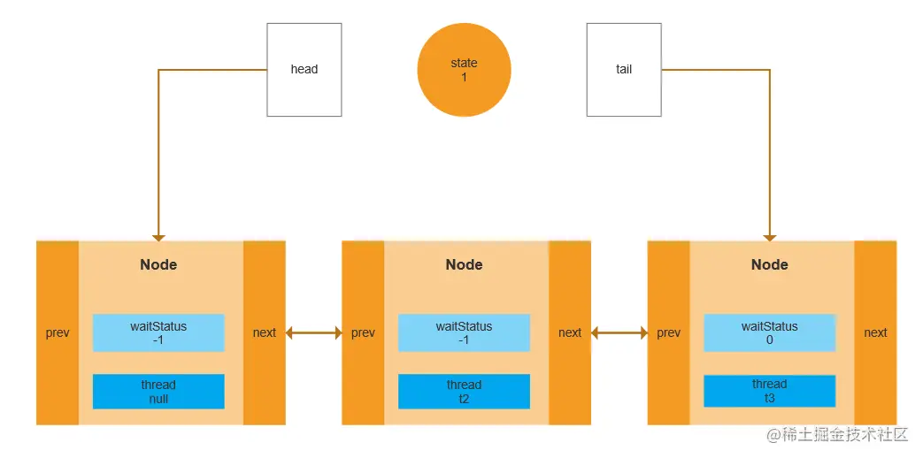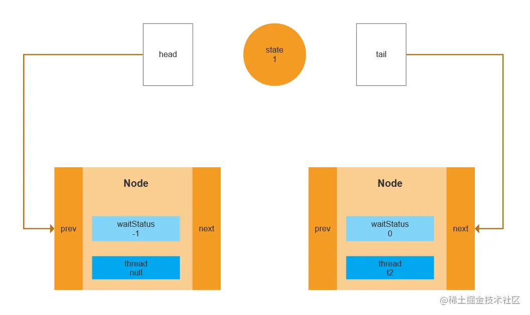 这个场景是怎么产生的呢?有一个线程正在占用锁,这时候再来一个线程就会出现这个场景。因为队列中第一个Node对应的是当前占用锁的线程,后面进来的线程就会被封装成一个新的Node放入队尾。这块代码道格李在实现的时候也是非常精髓的。看图。
