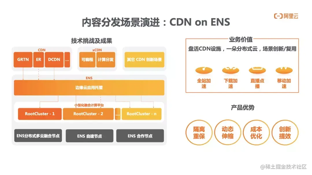 CDN作为最成熟的边缘云应用场景, CDN on ENS 全面整合边缘算力资源,在全站加速、下载加速、直播点播及移动加速等应用场景中极大提升资源利用效率,通过云边协同技术降低对于中心带宽成本和资源的压力,提升稳定性的同时提升用户体验。如618、双十一、双十二等电商大促和春晚红包活动等超大规模的场景磨炼,充分验证阿里云边缘云可以在确保不同业务隔离的前提下,灵活调配,达到优化和提效的目标。