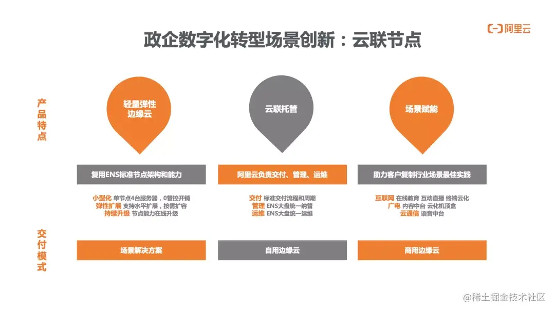 “软件+硬件”整体交付服务-边缘云联节点,可帮助企业级客户快速构建其本地基础设施,基于边缘云开展业务创新、市场拓展及商业探索,助力客户业务转型。针对企业客户关心的成本问题,云联节点最大的特点是轻量化,单节点4台服务器起,在轻量化的前提下产品能力不打折扣;在资产归属客户的情况下,阿里云负责交付到运维的全生命周期管理,降低客户的成本。