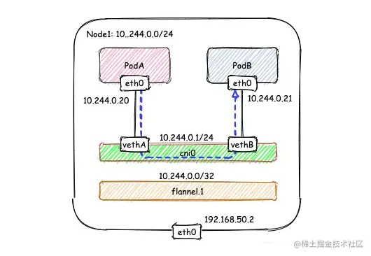 显然,节点内的容器间通信通过 cni0 网桥就能完成,不涉及任何VXLAN报文的封包解包。例如在下面的图例中,Node1的子网为10.244.0.1/24, PodA 10.244.0.20 和 PodB 10.224.0.21通过 cni0 网桥实现互通。