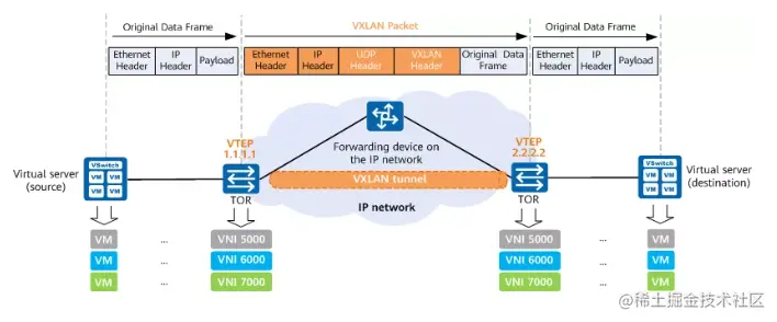 VXLAN使用VTEP(VXLAN Tunnel Endpoint)来进行封包和解包,它是VXLAN隧道的起点或终点: