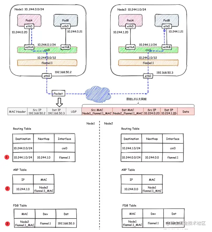 下一跳地址是10.224.1.0,关联ARP表②,得到下一跳的MAC地址,也就是目的MAC地址:Node2_flannel.1_MAC;