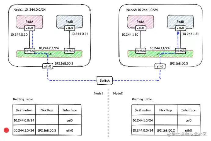 10.244.0.0/24 dev cni0 proto kernel scope link src 10.244.0.1 # Node1子网为10.224.0.0/24, 本机PodIP都交由cni0处理