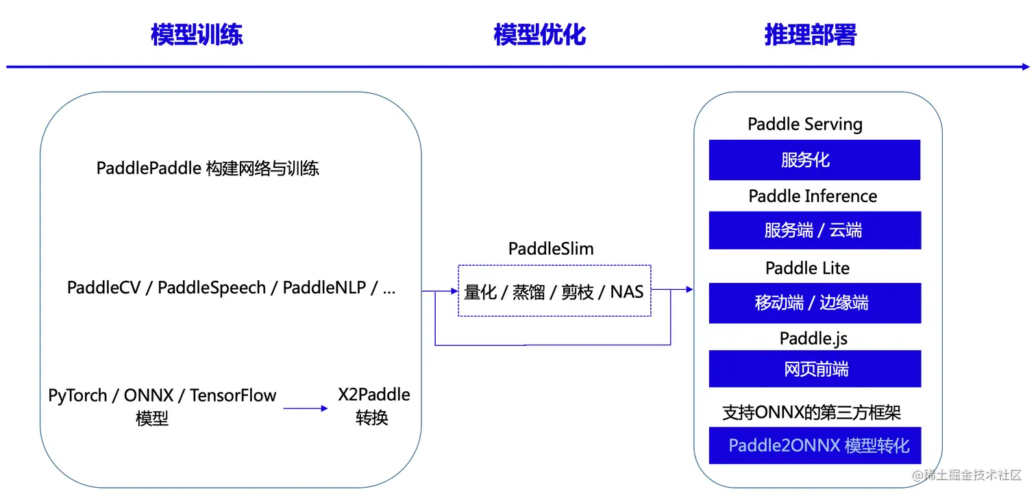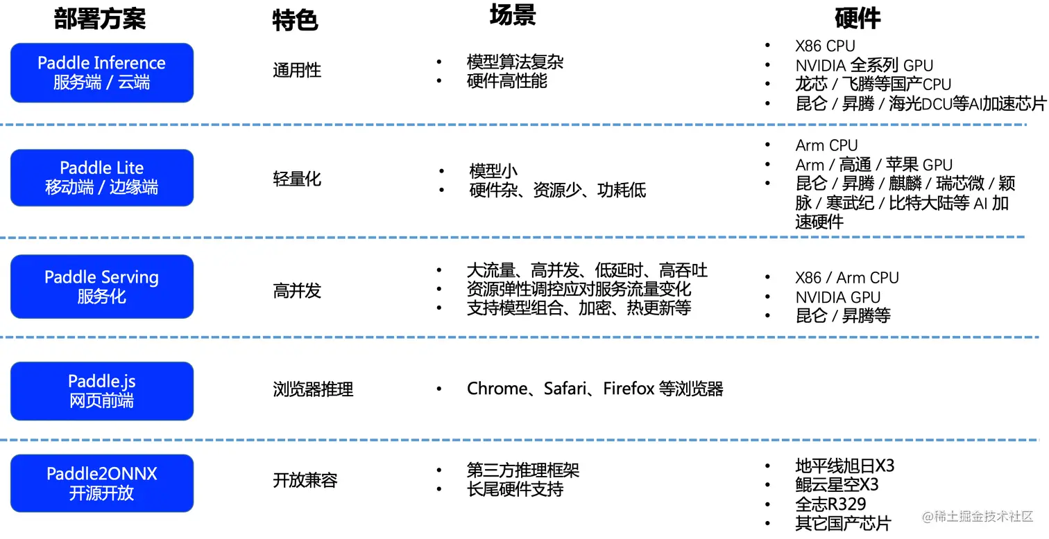飞桨模型可以选用PaddleSlim工具进行压缩、量化以及蒸馏,支持五种部署方案,分别为服务化Paddle Serving、服务端/云端Paddle Inference、移动端/边缘端Paddle Lite、网页前端Paddle.js, 对于Paddle不支持的硬件,比如MCU、地平线、鲲云等国产芯片,可以借助Paddle2ONNX转化为支持ONNX的第三方框架。