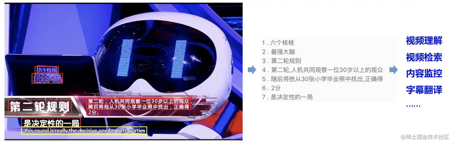除了面向垂类的结构化文本识别,通用OCR技术也有广泛的应用,并且常常和其他技术结合完成多模态任务,例如在视频场景中,经常使用OCR技术进行字幕自动翻译、内容安全监控等等,或者与视觉特征相结合,完成视频理解、视频搜索等任务。