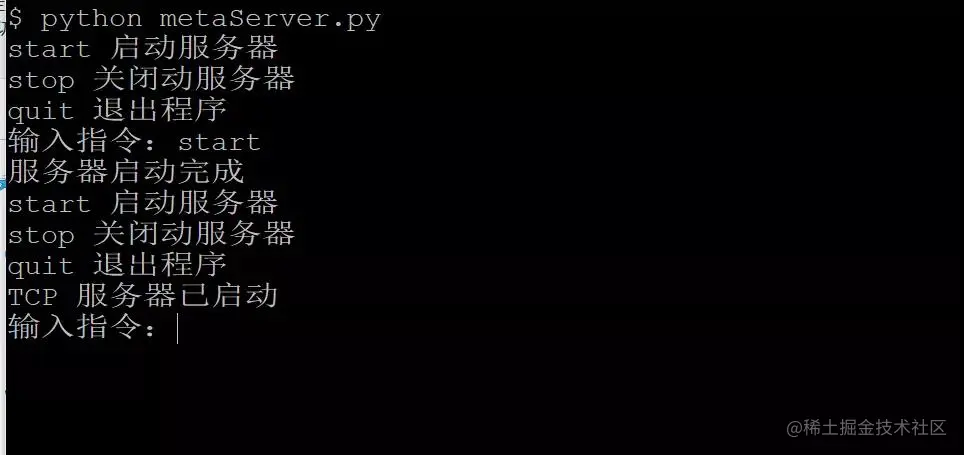 进入代码目录,启动命令行,执行 python metaServer.py,输入指令 start: