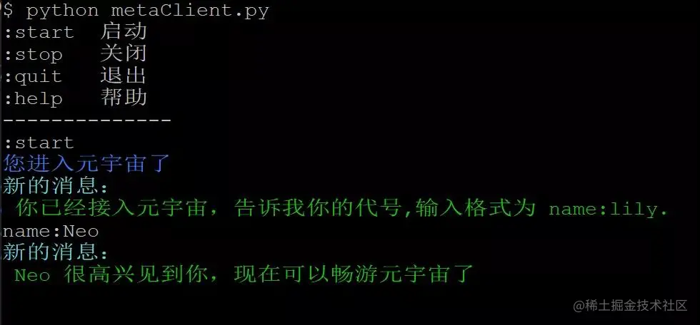 然后再打开一个命令行,执行 python metaClient.py,输入指令 :start,就可以接入到元宇宙: