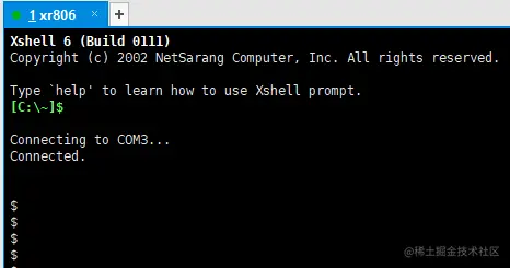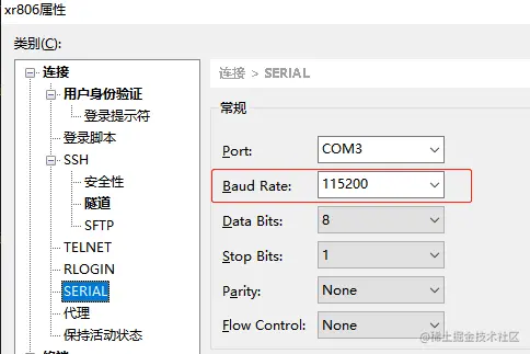 打开 Xshell,选择串口连接,波特率设置为 115200,如下: