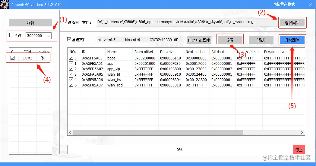 (5) 点击 "升级固件",开始烧录;