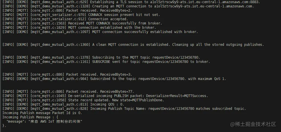 mqtt_demo_mutual_auth应用程序。cd bin ./mqtt_demo_mutual_auth