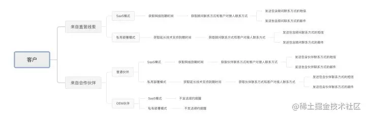 客户主要有两种来源:直营团队和合作伙伴。客户购买的产品分为两种模式:SaaS模式和私有部署模式。合作伙伴有两种合作模式:普通伙伴和OEM伙伴。发送两种模式的续约提醒:短信和邮件。根据以上规则,我们可以做以下流程图。