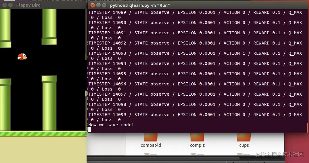 最后的输出层是一个全连接线性层,输出动作对应的Q值列表。一般来说,索引0代表什么也不做;在这个游戏里索引1代表跳一下。比较两者的Q值大小,选择大的作为下一步操作。