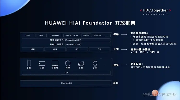 通过以上框架图,我们可以看到HUAWEI HiAI Foundation作为基础平台,主要由推理加速平台和异构计算平台两个部分组成。推理加速平台的作用是跟更多的上层推理框架完成对接,帮助开发者聚焦模型优化;异构计算平台则更好地使能NPU、CPU、GPU、DSP等计算IP,充分利用芯片算力。之后,HUAWEI HiAI Foundation可以实现多平台统一的赋能手机、平板、智慧屏、音箱等基于麒麟芯片的华为产品,并与HarmonyOS深度融合,在鸿蒙生态中起到端侧AI能力的积极作用。