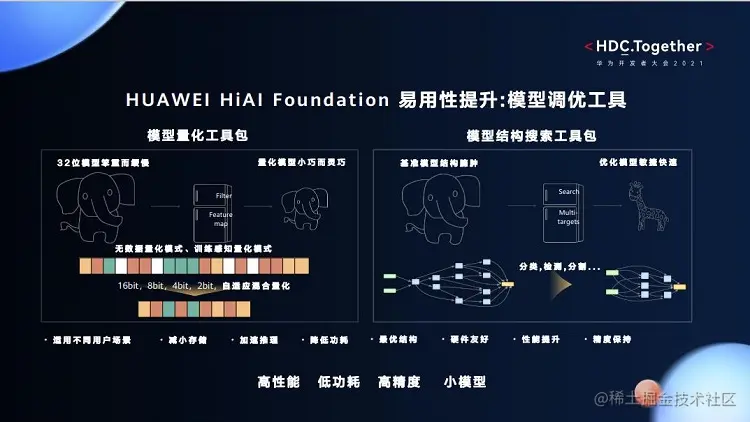 - 推出高性能、低功耗、高精度、小模型的模型调优工具。包括模型量化工具包和模型结构搜索工具包。前者推出了16bit、8bit、4bit、2bit和自适应混合量化,模型小巧而灵动,可以保障不丢失模型计算进度。后者则更多是通过自动搜索方式,帮助开发者结合硬件信息调整模型结构,使之更加敏捷快速。