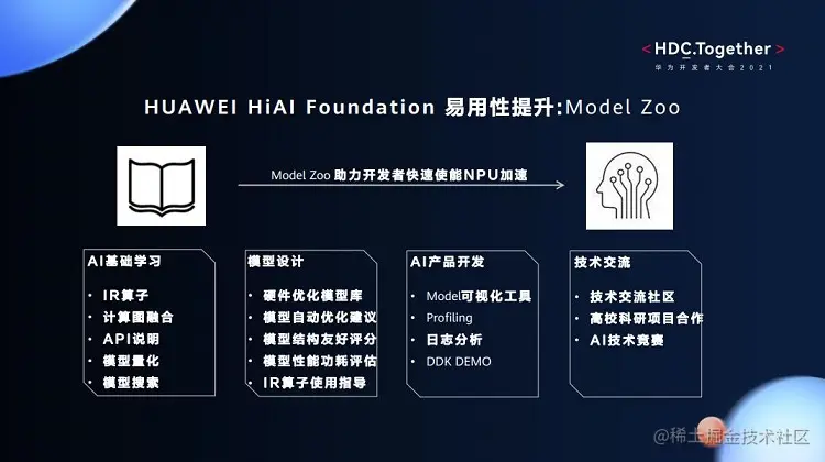- Model Zoo助力开发者快速使能NPU加速。Model Zoo综合了硬件优化模型库、模型优化指导以及技术交流社区的能力,通过它开发者可以快速知道哪一类模型在硬件上跑得速度更快,如何优化模型结构获取更好的能效收益等。技术交流社区除了便于开发者参与讨论交流外,也为后续高校科研合作项目、AI技术竞赛等提供基础。