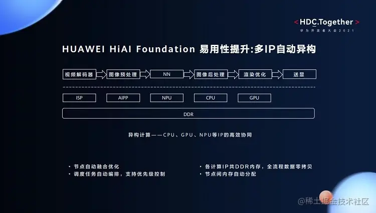 - 异构计算——CPU、GPU、NPU等IP的高效协同。下图列举了一个典型的数据流。从视频解码器到图像预处理,再到图像处理、渲染优化、送显等,经过了非常多的IP计算。那么这些IP怎样在较长的数据流中高效协同呢?这就需要多IP自动异构。它可以自动融合优化各计算节点,共享计算内存,做到多IP间数据零拷贝。另外,多IP的调度任务可以自动编排,支持优先级控制和节点间内存自动分配。