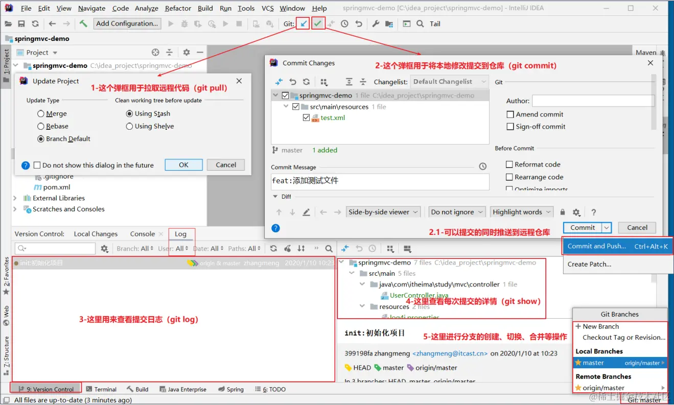 git的重点是用IDEA操作git,包括在IDEA中配置,查看提交记录等等的git命令,git是分布式版本控制工具,它解决了多人合作写项目交互复杂的难题,再也不用copy到U盘里面了,并且一些开源的资源也可以放到远程仓库中,即防止了代码因操作不当丢失,又方便了管理。在使用IDEA操作git中主要就是明确操作步骤,比如要先提交代码,再在一些窗口中操作和查看,因为git命令都被简化成了IDEA中的一些按键功能,所以理解了git的原理之后,只需记住对应的按键即可。