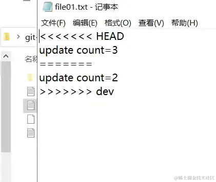当两个分支对同一文件进行修改的时候会出现冲突,冲突发生后会生成如下文件: