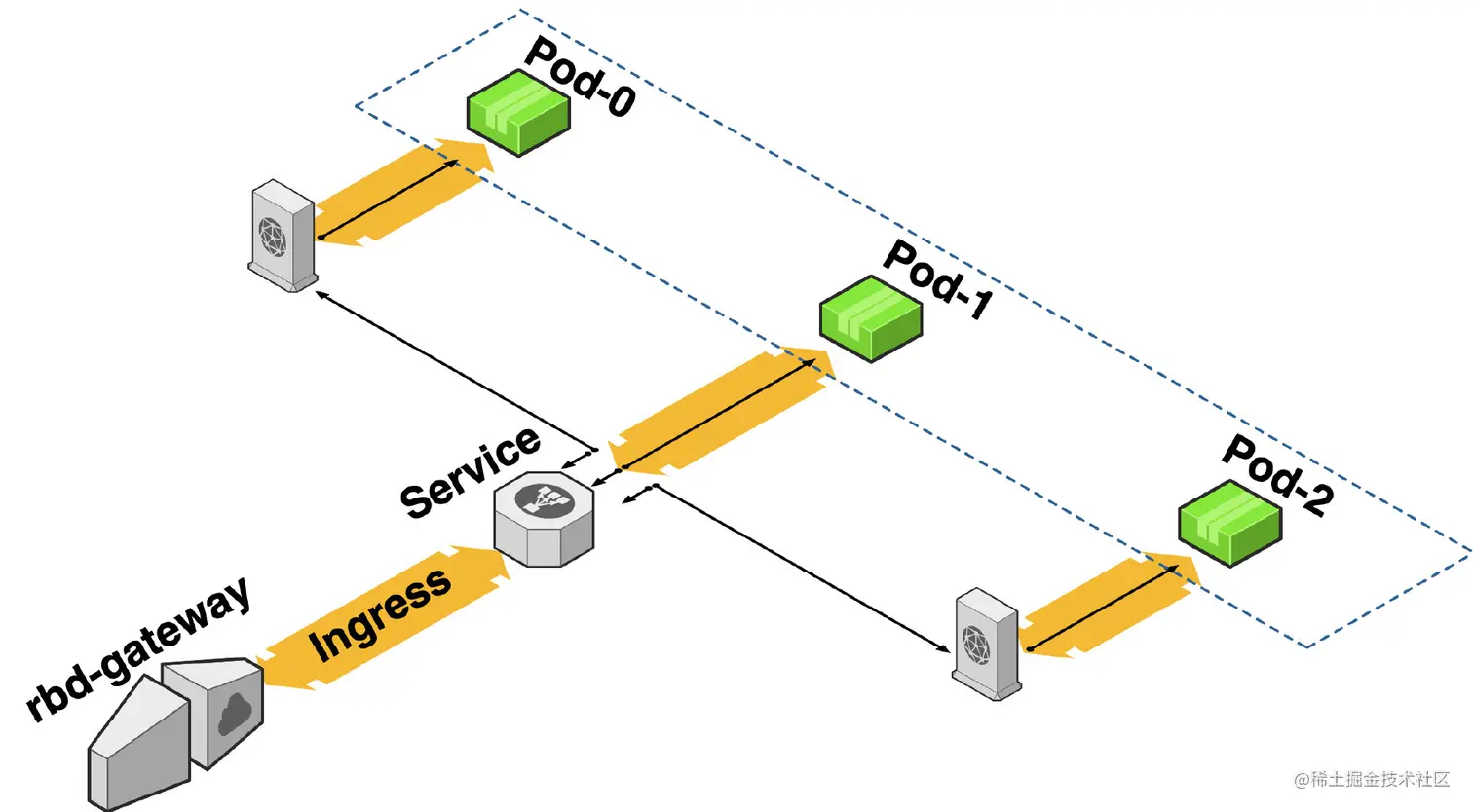 实际上,这一条路由规则,是由 Kubernetes 中对应的 ingress 和 service 所定义的。整个访问链路可以归纳为下图: