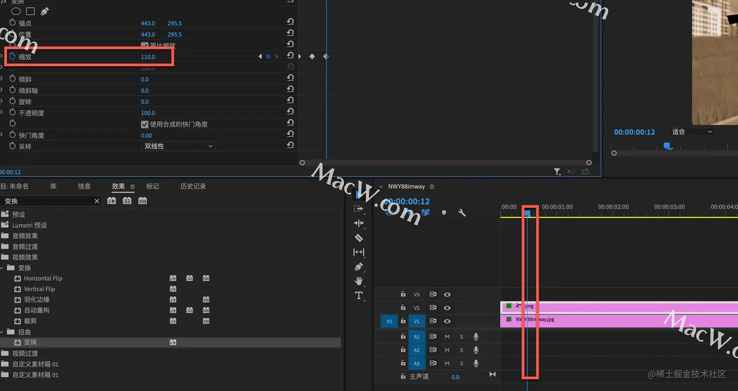 继续将时间线向后移动6帧,将缩放的参数调整为110%