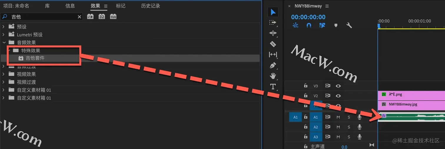 如果这段音频是原音录制可以添加一些效果,在效果中搜索吉他,将吉他套件添加给音频素材