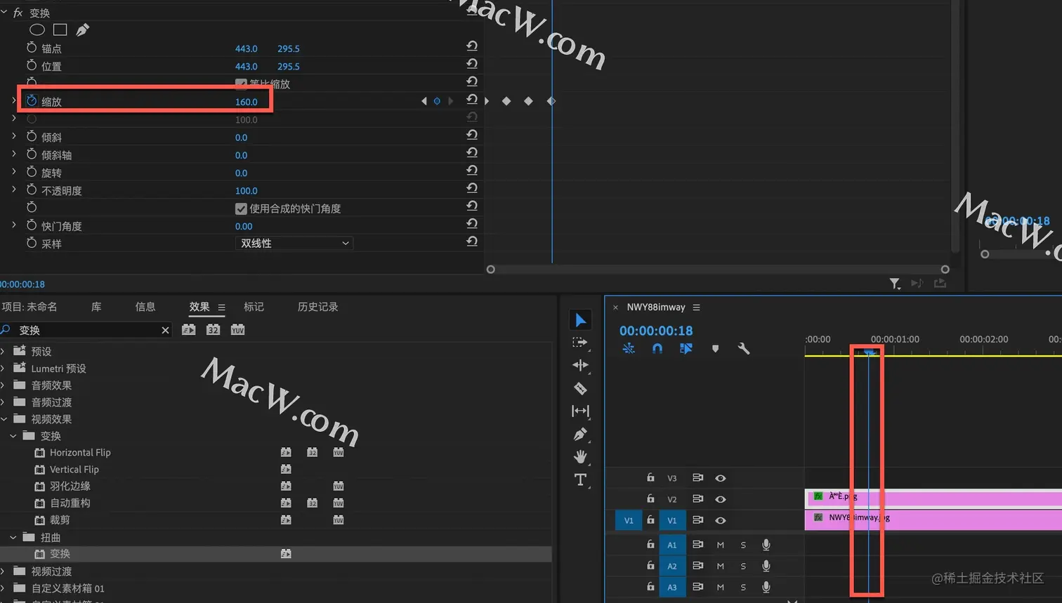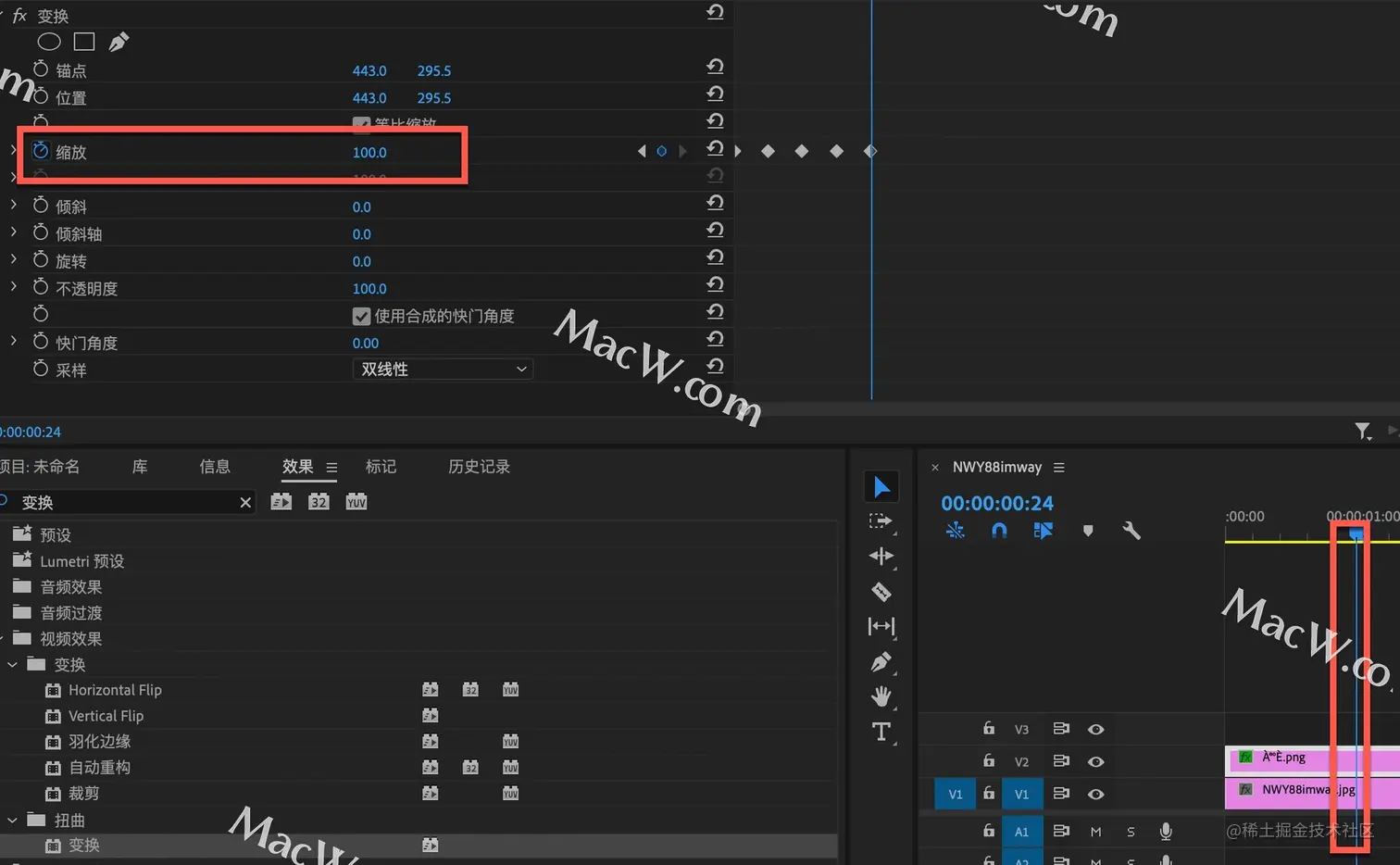 继续将时间线向后移动6帧,将缩放的参数调整为100%