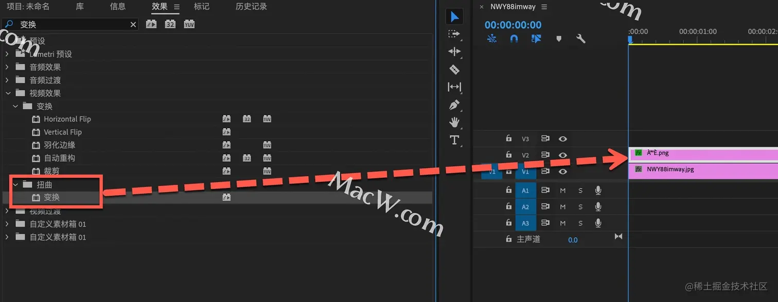选中V2轨道中的喇叭播放素材,在效果中搜索变换,将此效果添加给该素材