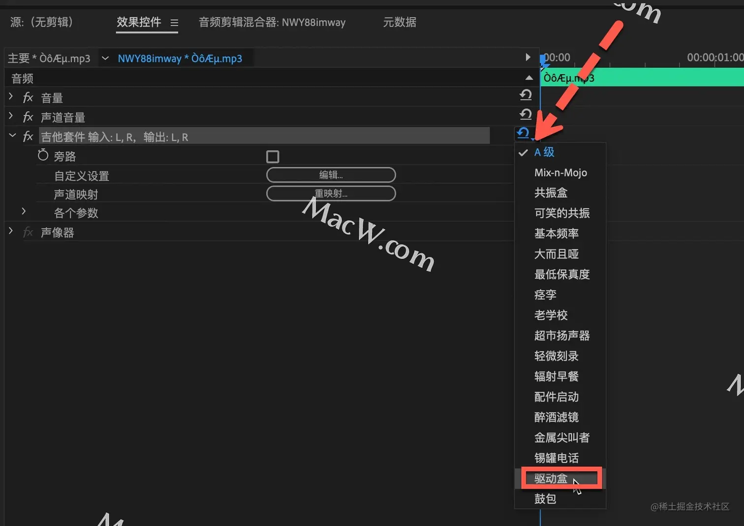 在左侧的效果控件-吉他套件中,点击最右侧的三角标志,选择驱动盒,这样就会出现播音效果