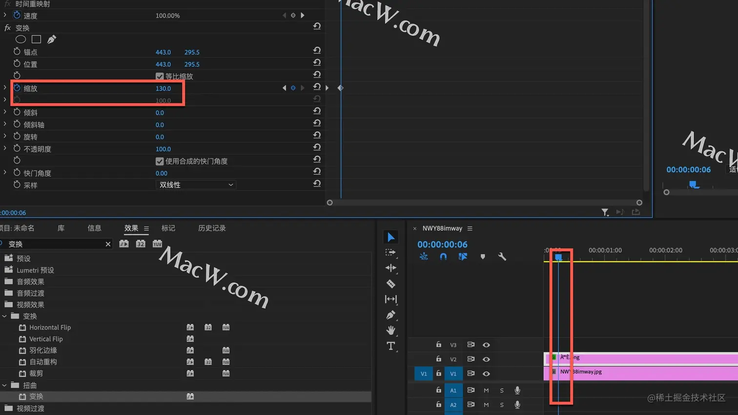 在左侧的效果控件-变换中,新建一个缩放关键帧,将时间线向后移动6帧,然后将缩放的参数调整为130%(这些参数都可以按照自己的喜好来设置,没有固定数值)