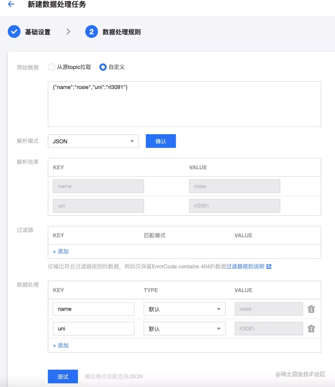 以上是一些简单清洗规则界面化展示,更高级的清洗规则后续会支持编写函数进行配置。解析模式支持JSON、分隔符、正则表达式,点击测试可以验证上面设置的数据处理规则。