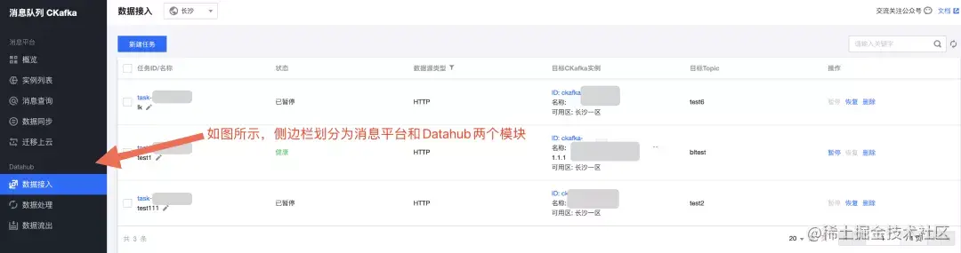 如下图所示,在消息队列CKafka控制台的侧边栏划分为消息队列和DataHub两个模块,查找方便,使用更方便,目前DataHub已经上线,有需要使用数据接入与数据处理分析功能需求的用户,可以用起来啦!