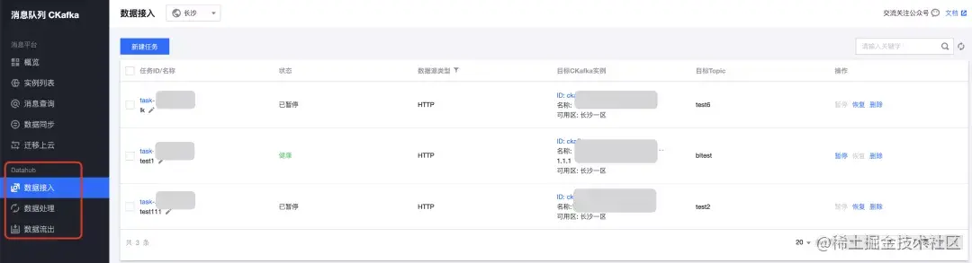 数据接入的控制台界面如图所示,展示用户建立的数据接入任务列表。