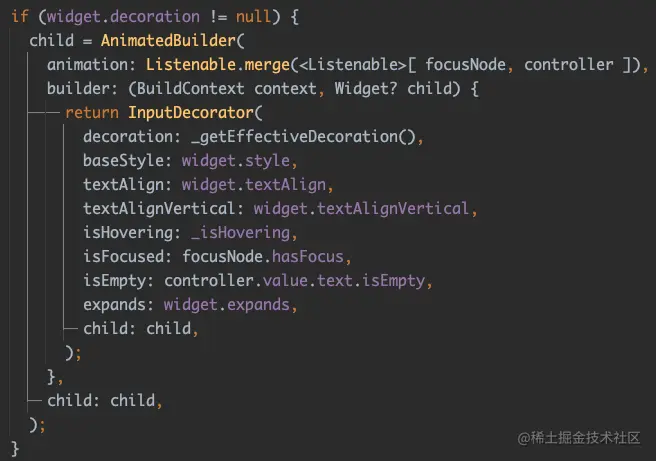 关于 InputDecorator 的内部参数解析这里就不多说,以前在书里已经有详细介绍过,用过 TextField 的大家对于 InputDecorator 应该也不会陌生,在 TextField 里 InputDecorator 的实现是和 AnimatedBuilder 一起组成使用。