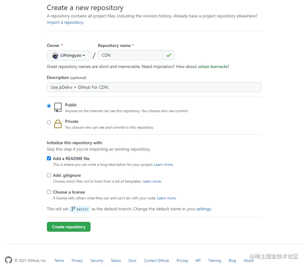 在 Github 新建一个名为 CDN 的仓库,如下所示: