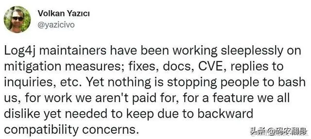 实际上,他是Log4j 2 的初始作者,在这个小团队中,活跃成员现在只有6个人,包括位于荷兰阿姆斯特丹的Volkan Yazici, 一位为 bol.com 工作的程序员。