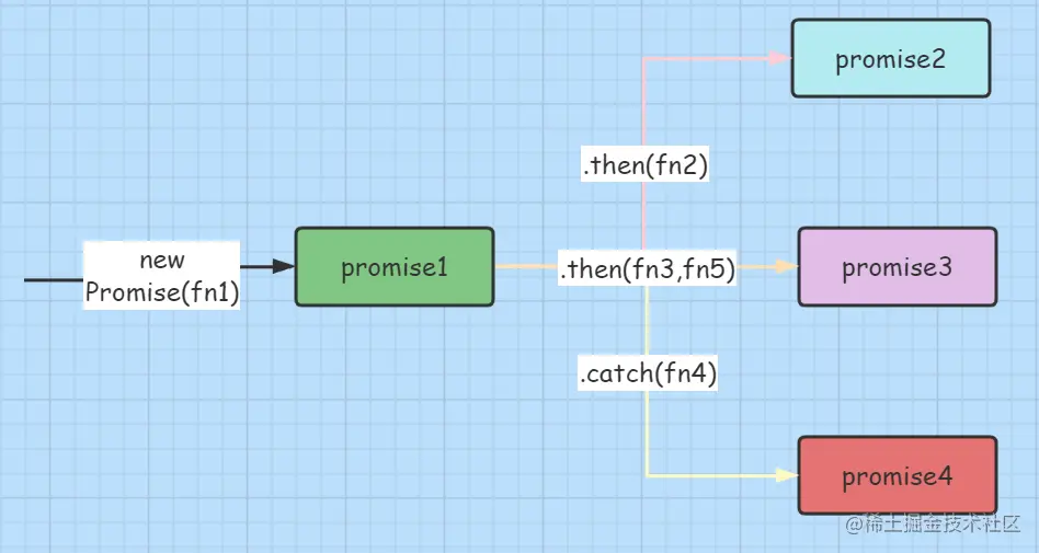 显然,由 new Promise 创建的 promise1 是由 fn1 操控的,操控的过程是:由它内部调用 resolve 或者 reject 来改变 promise 的状态,如果执行过程出错就帮它 reject。那 then 和 catch 返回的 promise 呢?显然是传入 then 中的函数,比如 promise3 就由 fn3 或者 fn5 操控,promise1 是 resolved 就执行 fn3,否则 fn5, 所以,一个 promise 状态映射一次函数执行状态,接下来我们要做的就是实现将【函数执行状态映射为 promise 的状态】的操控过程,具体而言与 contructor 中对 excutor 做的事情差不多:执行成功后resolve(结果)与出错时reject(错误信息)。