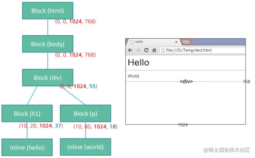 布局是一个递归的过程,从根渲染器开始,计算每个节点的几何信息,确定渲染树中所有节点的宽度、高度和位置,以及确定每个页面上每个对象大小和位置。