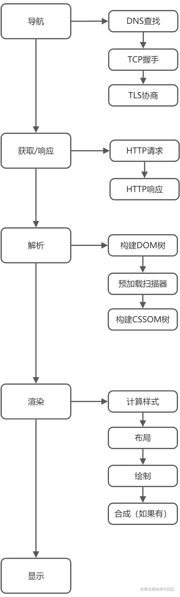 导航流程就是在输入URL之后,根据域名去DNS系统查询对应的IP地址,根据得到的IP地址发起网络连接,经过TCP三次握手和TLS握手协商之后建立连接,服务器向浏览器响应数据的过程。下图展示了导航的基本流程