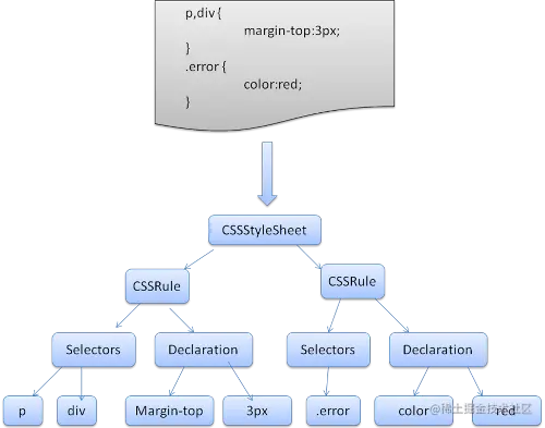 浏览器通过CSS相关的解析器,将CSS解析成CSSOM树,CSS解析器会将CSS文件解析成StyleSheet对象,且每个对象都包含CSS规则,CSS规则对象包含选择器和声明对象,以及其他与CSS语法对应的对象。