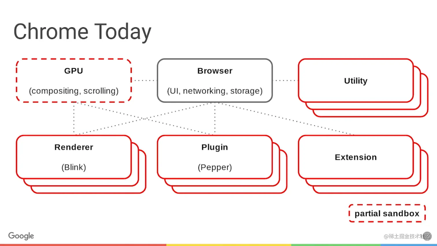 Chrome 的 UI 界面选择采用 GPU 来绘制,这使得 GPU 成为浏览器普遍的需求。Chrome 在其多进程架构上也引入了 GPU 进程。