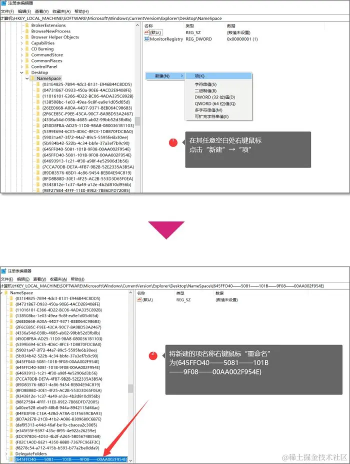 “HKEY_LOCAL_MACHINE→SOFTWARE→Microsoft→Windows→CurrentVersion→Explorer→DeskTop→NameSpace”,在最后一步的那个文件夹内右侧任意空白处鼠标右键,点击新建项。而新建的项都会以系统默认名称自命名,我们需要右键一下鼠标点击“重命名”为“{645FFO40——5081——101B——9F08——00AA002F954E}”这个名称(记得加括号哦!它也是一份子);