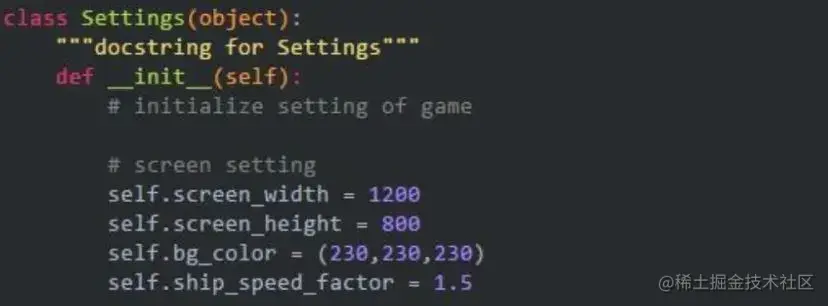 为了在写游戏的过程中能便捷地创建一些新功能,下面额外编写一个settings模块,其中包含一个Settings类,用于将所有设置存储在一个地方。这样在以后项目增大时修改游戏的外观就更加容易。