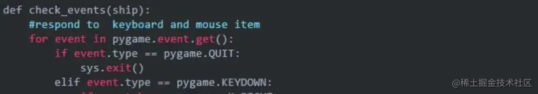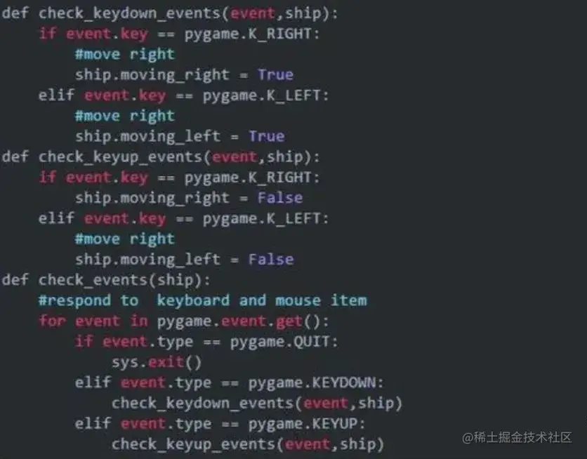 因为在pygame中,每次按键都被注册为KEYDOWN事件,在check_events()中,我们通过event.type检测到KEYDOWN事件后还需进一步判断是哪个按键。代码如下: