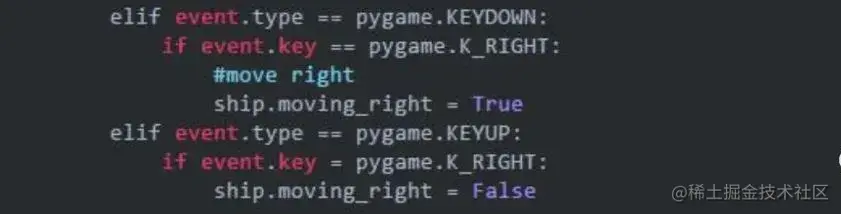 飞船不动时,标志moving_right将为false。玩家按下右箭头时,我们将这个标志设置为True;玩家松开时,我们将标志重新设置成False。