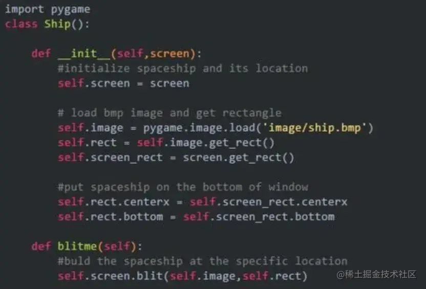 接下来,我们需要将飞船加入游戏中。为了在屏幕上绘制玩家的飞船,我们将加载一幅图像,再使用Pygame()方法blit()绘制它。